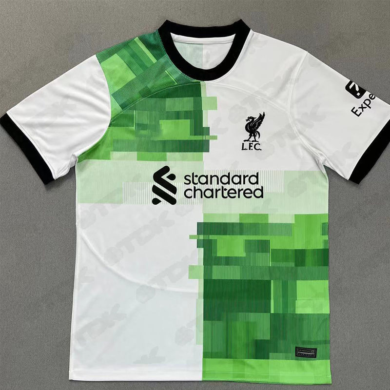 23-24 موسم ليفربول بعيدًا باللونين الأخضر والأبيض ، نسخة المروحة من البوليستر المتين من البوليستر